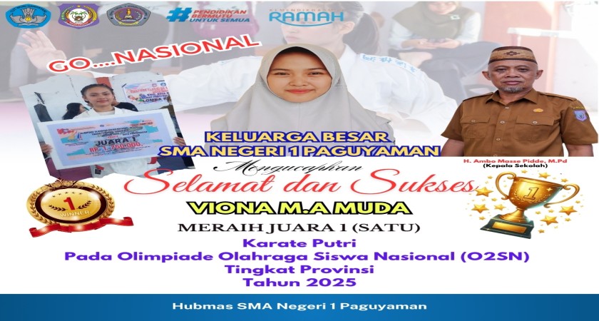 Sebuah kebanggaan bagi masyarakat Boalemo, salah seorang atlet karate putri asal SMA Negeri 1 Paguyaman, Kabupaten Boalemo, Viona MA Muda sukses meraih juara 1 pada lomba O2SN tingkat Provinsi Gorontalo.